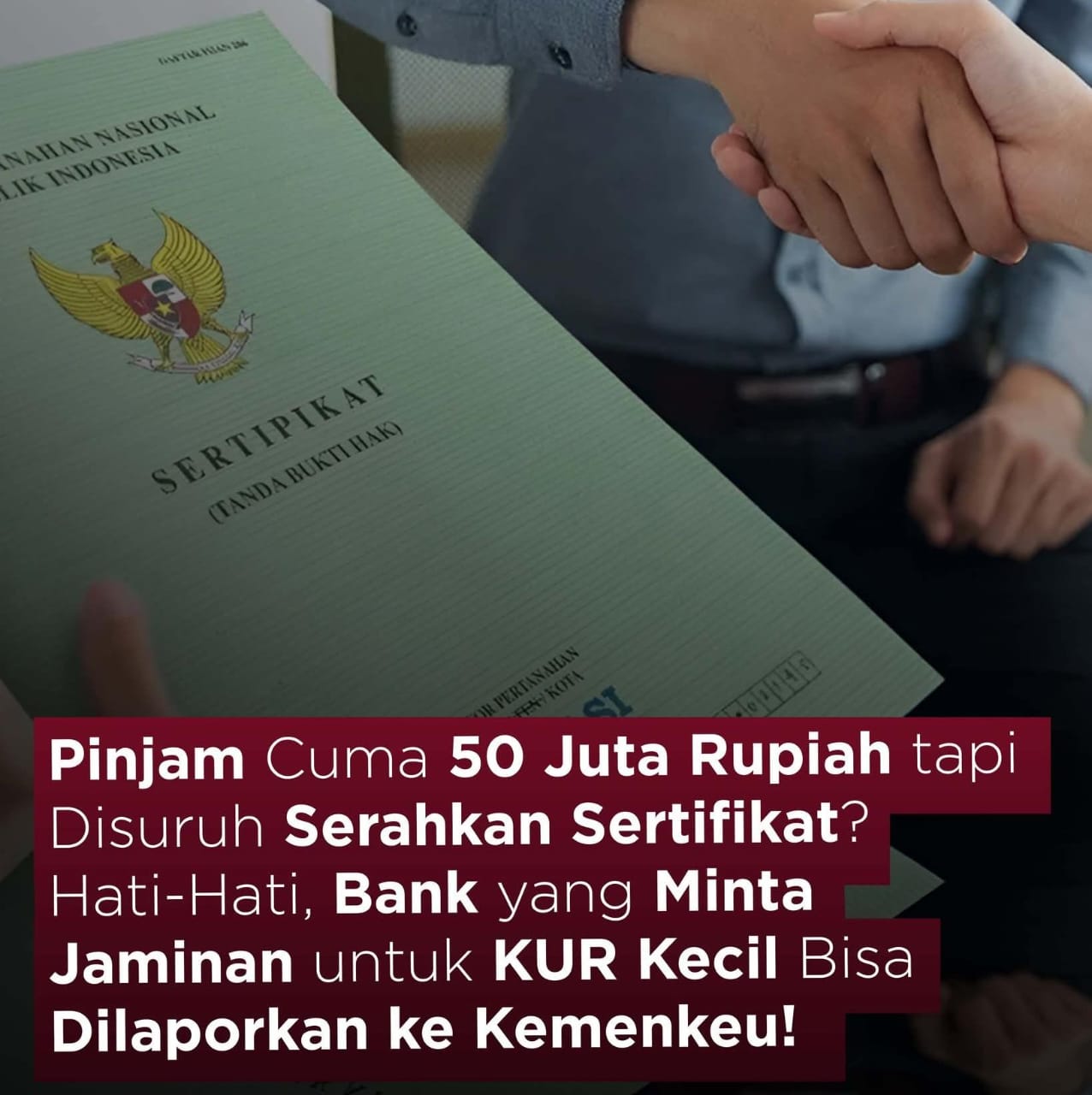 Kenyataannya, masih banyak kasus di lapangan di mana masyarakat atau pelaku usaha kecil terpaksa menyerahkan jaminan berupa surat kendaraan, sertifikat tanah, atau aset pribadi lainnya hanya untuk mendapatkan pinjaman KUR di bawah 100 juta rupiah.