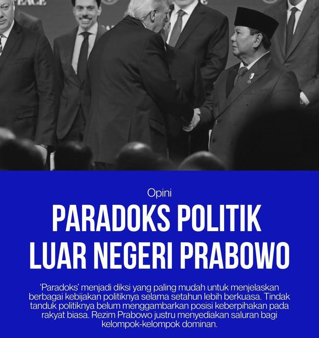 REPORTASE INDONESIA – Jakarta, ‘Paradoks’ menjadi diksi yang paling mudah untuk menjelaskan berbagai kebijakan politik Prabowo selama setahun lebih berkuasa. Tindak tanduk politiknya belum menggambarkan posisi keberpihakan pada rakyat biasa. Rezim Prabowo justru menyediakan saluran bagi kelompok-kelompok dominan.